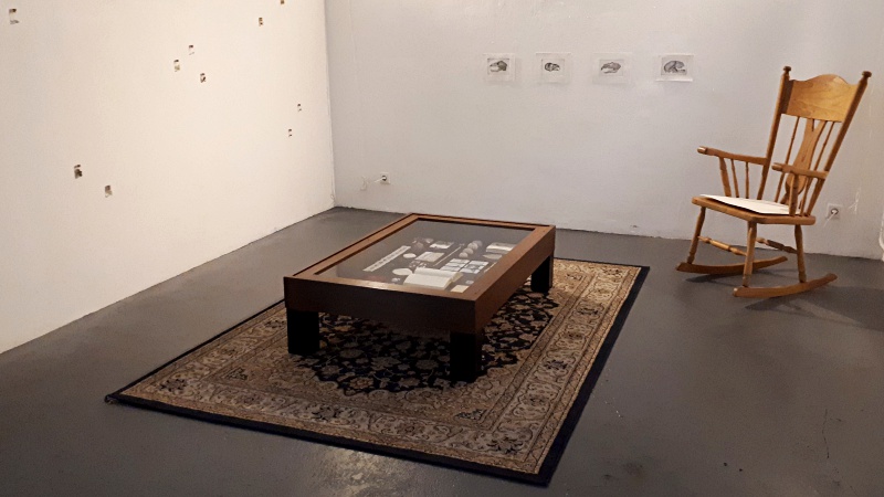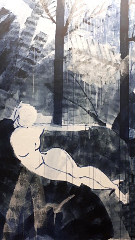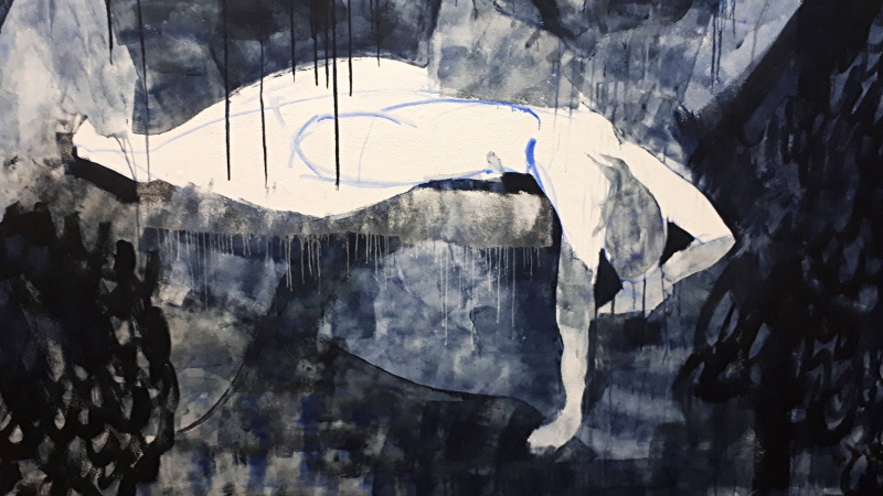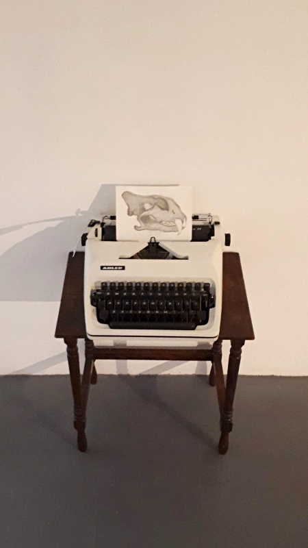 ‘Impermanence’ is a motif that runs through all works. Jochem van den Wijngaard transformed one room with wall-covering murals in shades of blue. He depicts female figures surrounded by nature, one referencing Henry Fuseli’s The Nightmare (1781) and the other Henri Rousseau’s The Dream (1910). An unintentional overlap with Lotte van Lieshout’s imagery is apparent. Nina van Dijk portrays a type of living room. In the corner a piece of paper rests on a rocking chair. When looking from the right angle, this uncovers a sleeping cat – a fossil alike. The quite literal interpretation of transitoriness is also apparent in the drawings of pet skulls and bottles with transient natural objects. Marlijn van Zadelhoff lays bare the impermanence of nature, by exhibiting leaves and branches that are decaying during the exposition. Bente van Olderen refers to the inevitable feeling of loss. Her collage of scratched pictures, quotes, and drawings simultaneously grasp and let go of memories.