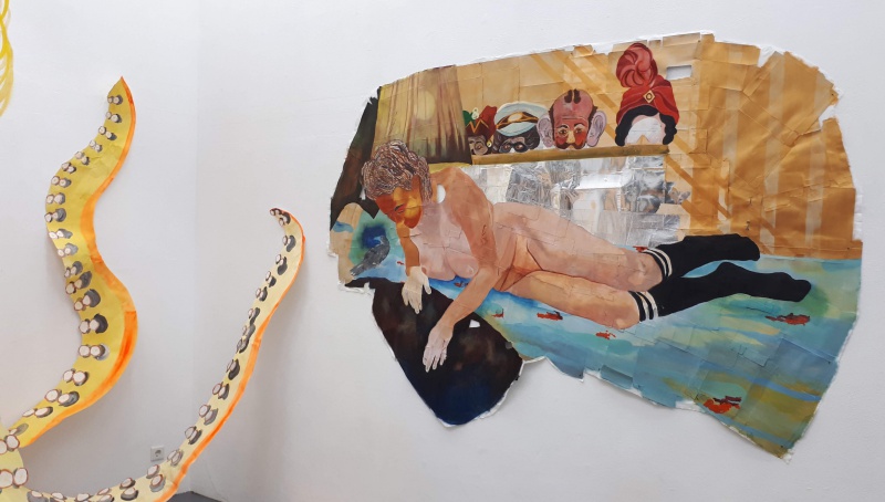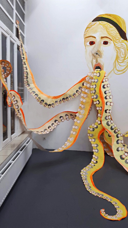 Lotte van Lieshout painted an apparition of herself. The packing cardboards she uses as canvas form the shape of the brain. The portrayed lying figure holds her hands in a black pool that forms the so-called cerebellum. In human functioning, the cerebellum is dominantly associated with balance and coordination. The figure absorbs the black substance as solace and strength. This is precisely what this work radiates. The artist explains that the inspiration for the work was an experience she had in a hospital elevator: “I saw myself in the reflection, I recognised myself but I had an emotionless expression.” The aluminium tape refers to this mirror. She translates how her physical state is linked with her mental state. In other words, how the mind is embodied. Her other work in the room is an in-situ installation. The mural is a self-portrait, reminiscent of Caravaggio’s Medusa, with paper octopus tentacles coming out of the mouth that creep through the space and into the hall. In terms of the colours, she was inspired by murals from Fra Angelico.