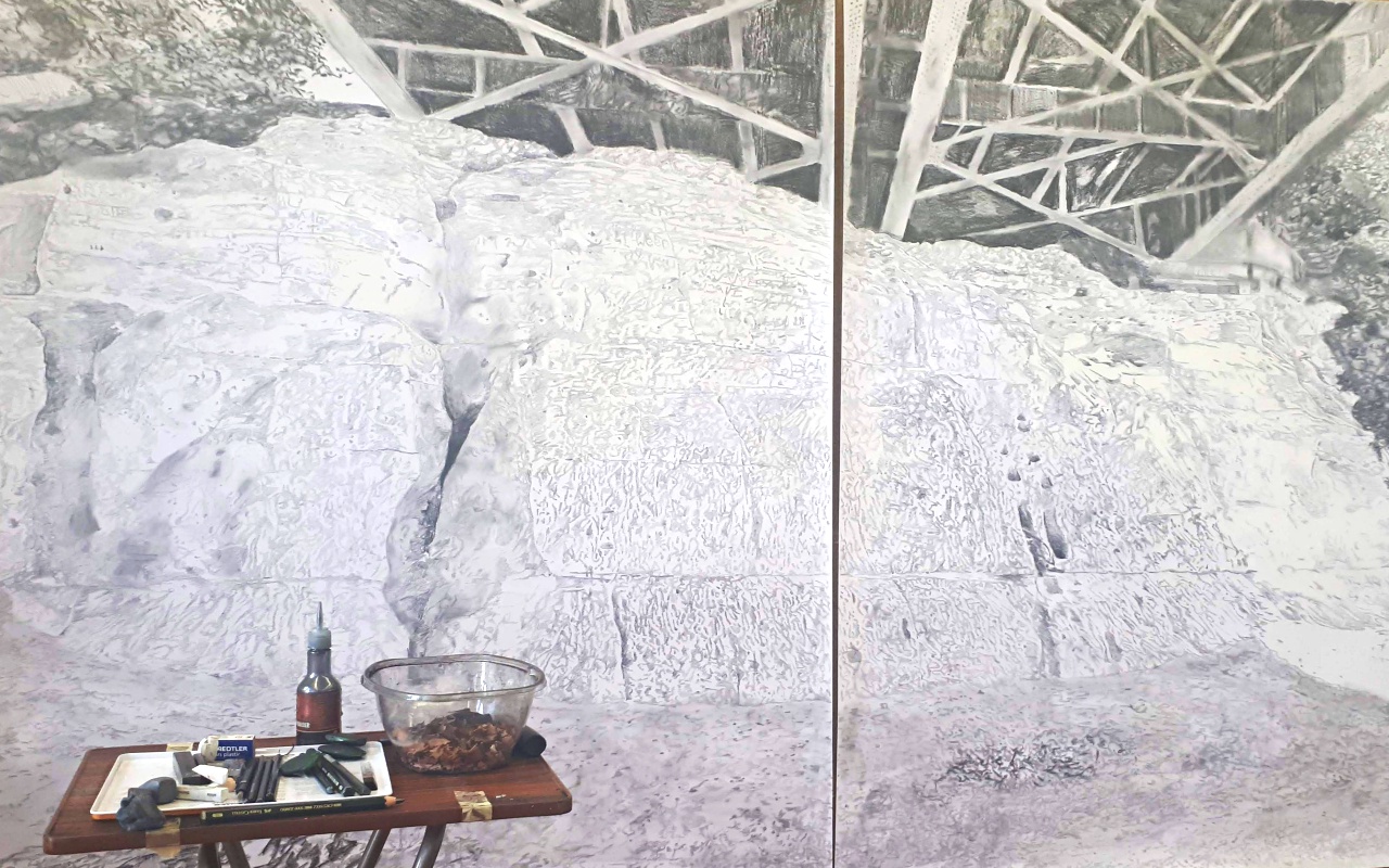 The majority of the drawings are large-scaled. Pencil lines fill up meters-long sheets, giving the viewer an immediate wondrous and monumental sense. Drawing with graphite, the depiction of stone poetically comes together with the drawing material. The material expression in the drawings is remarkable, considering it ‘only’ consists of pencil on paper. Gam Bodenhausen adopts different techniques. These vary from delicate to rough strokes, and from smudging to scratching. The result is a vivid scene that is recognisable and at the same time speaks to the imagination. The choice to stay restricted to black and white is deliberate. She argues: “you see so much more when you leave elements of reality, such as colour, out.”