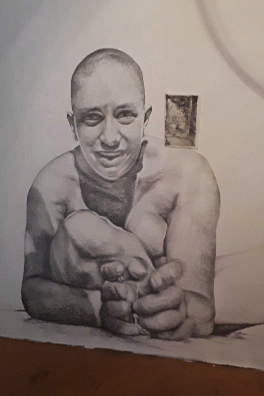 This clarifies why Lise Sore needs to actually feel the emotion in order to translate it to the fabric. That is, pencil strokes are physical movements, which unconsciously and involuntarily derive from her emotional being. For instance, one of her screaming, desperately angry portraits consists of deep and rough lines, whereas a more thoughtful and silent one is visibly drawn gently and softer. The technical gestures follow her embodied emotional state.