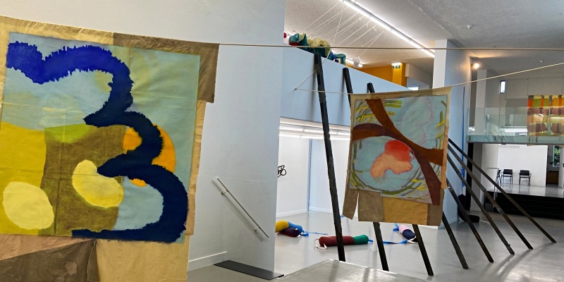 De balken zijn een poëtische tegenhanger van de golvende touwen en spanbanden die Maike Hemmers’ werk dragen. Voor ‘Moon River (Frank Ocean)’, ‘Open Heart 2’, ‘Fruit Trees (of marjolijn en line)’ en ‘Draping, Stitching, Tethering (places I’ve been last summer)’* gebruikte zij natuurlijke materialen om het textiel mee te verven. De grondstoffen hiervoor heeft ze zelf geplukt. Dit betekent dat de kleur in de loop van de tijd zal vervagen door de blootstelling aan licht.