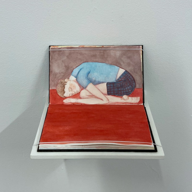 Hannelotte van Elst verbeeldt in haar werk haar geleefde ervaring. Ze begon met tekeningen in een dagboek – deze is ook te zien in de tentoonstelling – waarmee ze grip probeerde te krijgen op de constant veranderende, onvoorspelbare situatie waar ze zich in bevindt. Dat heeft uiteindelijk geleid tot de zelfportretten die we hier zien. Hierin visualiseert ze haar pijn en zoektocht, en maakt ze zichtbaar wat niet direct zichtbaar is. Tekenen en schilderen zijn voor haar een proces om zichzelf beter te leren kennen. Als ze naar een zelfportret kijkt, lijkt het, in haar woorden: “alsof ik in de spiegel kijk, maar dan echt.”