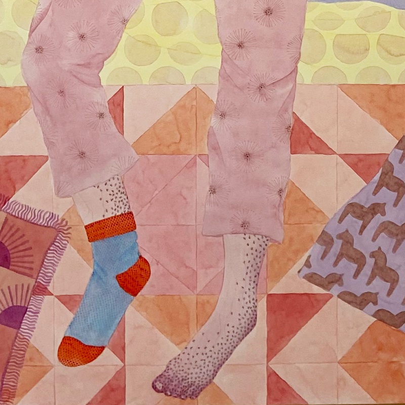 Hannelotte gebruikt veel patronen en symbolen in haar werk. De zon en de maan staan bijvoorbeeld voor het verstrijken van de tijd, en de bloeiende en verwelkte bloemen voor hoe mensen je zien tegenover hoe je je écht kan voelen. Zo heeft alles in het beeld een onderliggende betekenis. Al wil ik jullie graag uitnodigen om zelf te kijken en te bedenken wat iets voor jou persoonlijk zou kunnen betekenen.